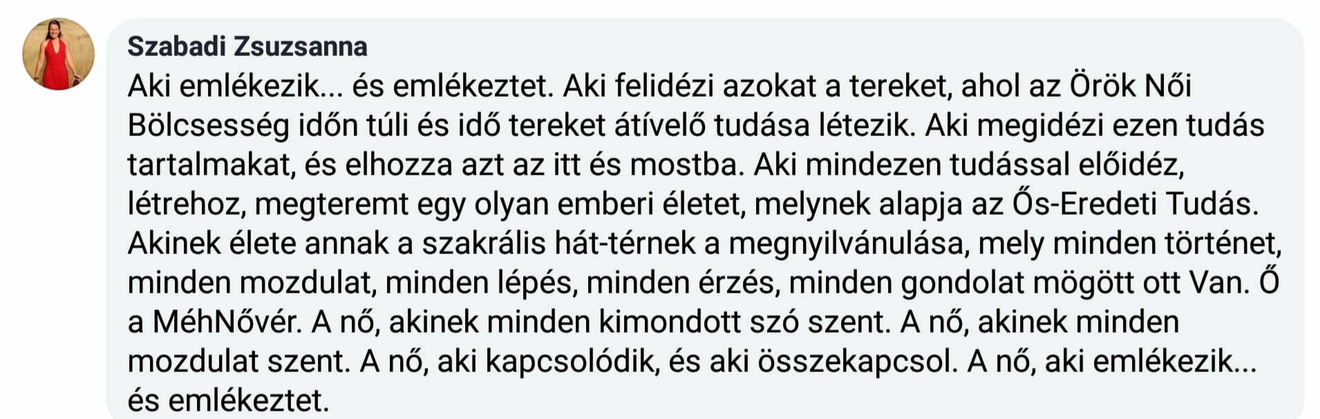 „A maghari, egyiptomi, krétai, delphoi, kis ázsiai, folyamközi és indián rítusok ősi beavatásainak megismerése és átélése készített fel arra, hogy a női Méh szentélyét áldó rítusokat és a méh felszentelését magam is végezzem. Utazásaim a fontos szakrális hagyományokat őrző erőhelyekre, beavató és egyben néprajzi értelemben is gyűjtő utazásokká váltak. Több éve tartok MéhKirálynő tanfolyamot, női műhelymunkát és méh gyógyító köröket, női erőforrás aktiváló mozgás meditációt, női energiarendszer előadásokat és mozgásformát (NEF). Az egyik máltai úton az IstenAnya ősi szigetén járva a női méh áldásának és felszentelésének ottani ősi rítusát is megismerhettem. A Születés Templomában töltött születésnapom test-szentély és méh áldása talán a legszebb a rítusok között. A születésnapi beavatás újabb szintjére hívott el küldetésemnek. Női KörVezetői és méh gyógyító tapasztalataimat átadni, nőtársaimat tanítani, hogy maguk is méhnővérekké váljanak és a nőiség beavató útján kísérhessék nővéreiket. Szellemi tradíció és tudáskincs értelmében a MéhNővér a Grál Papnője, az életmisztériumok ismerője és átadója, beavató és kísérő minőség.