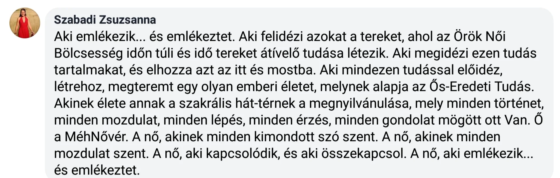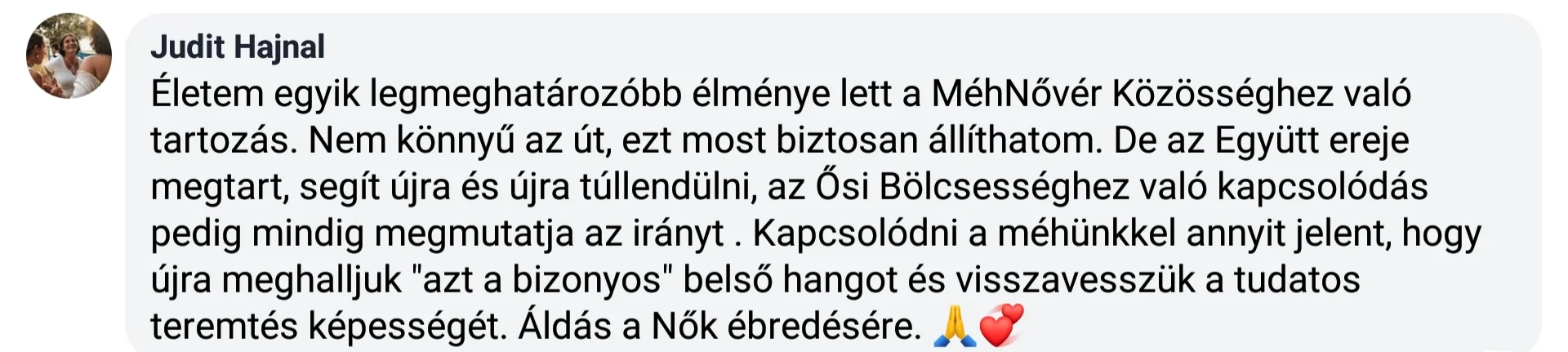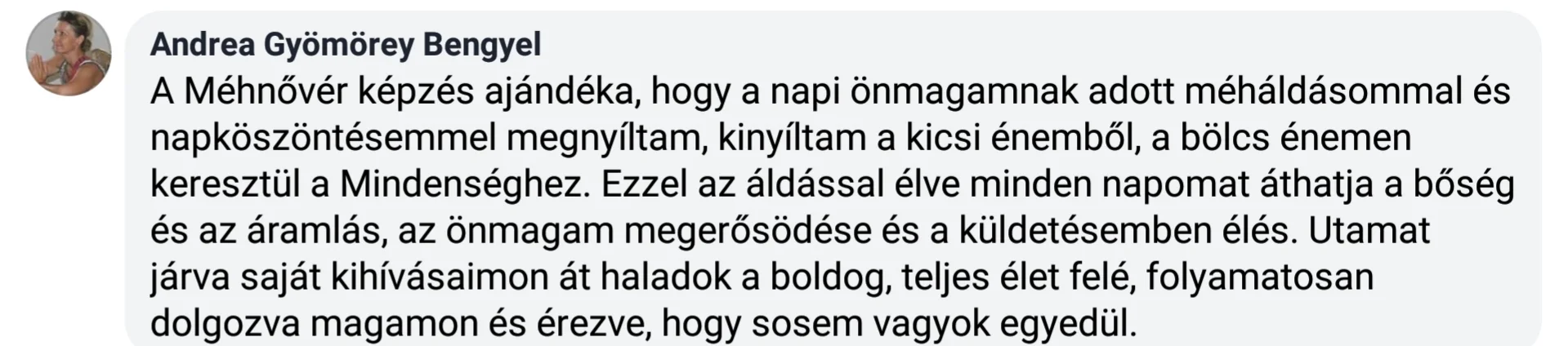 „A maghari, egyiptomi, krétai, delphoi, kis ázsiai, folyamközi és indián rítusok ősi beavatásainak megismerése és átélése készített fel arra, hogy a női Méh szentélyét áldó rítusokat és a méh felszentelését magam is végezzem. Utazásaim a fontos szakrális hagyományokat őrző erőhelyekre, beavató és egyben néprajzi értelemben is gyűjtő utazásokká váltak. Több éve tartok MéhKirálynő tanfolyamot, női műhelymunkát és méh gyógyító köröket, női erőforrás aktiváló mozgás meditációt, női energiarendszer előadásokat és mozgásformát (NEF). Az egyik máltai úton az IstenAnya ősi szigetén járva a női méh áldásának és felszentelésének ottani ősi rítusát is megismerhettem. A Születés Templomában töltött születésnapom test-szentély és méh áldása talán a legszebb a rítusok között. A születésnapi beavatás újabb szintjére hívott el küldetésemnek. Női KörVezetői és méh gyógyító tapasztalataimat átadni, nőtársaimat tanítani, hogy maguk is méhnővérekké váljanak és a nőiség beavató útján kísérhessék nővéreiket. Szellemi tradíció és tudáskincs értelmében a MéhNővér a Grál Papnője, az életmisztériumok ismerője és átadója, beavató és kísérő minőség.