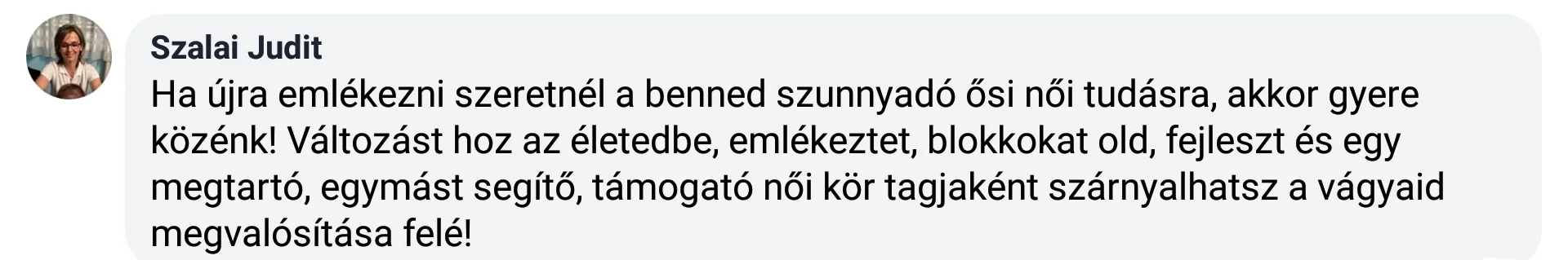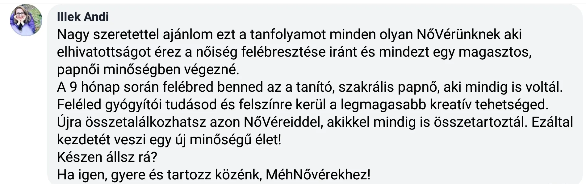 - a nővériség megtapasztalását: igazi, támogató, gyógyító és kísérő szakrális nővéri jelenlétet a csoportban
